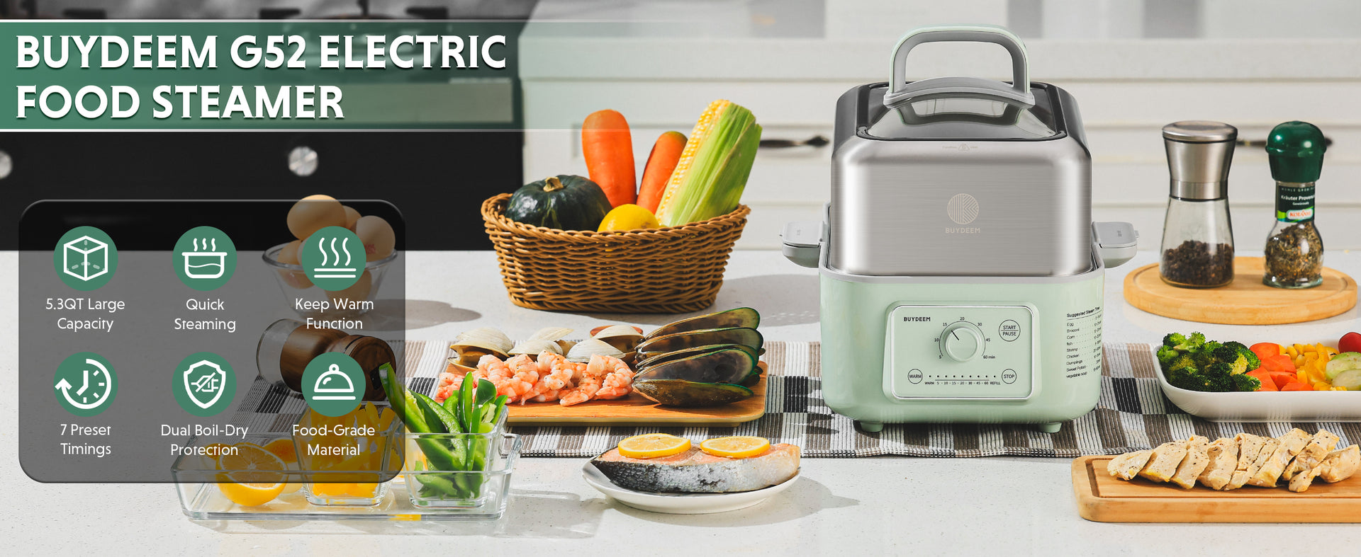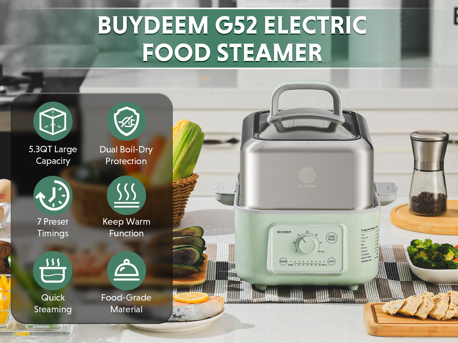 The G52 Food Steamer features 7 steam settings for precise cooking, dual boil-dry protection for safety, and a space-saving design perfect for any kitchen.